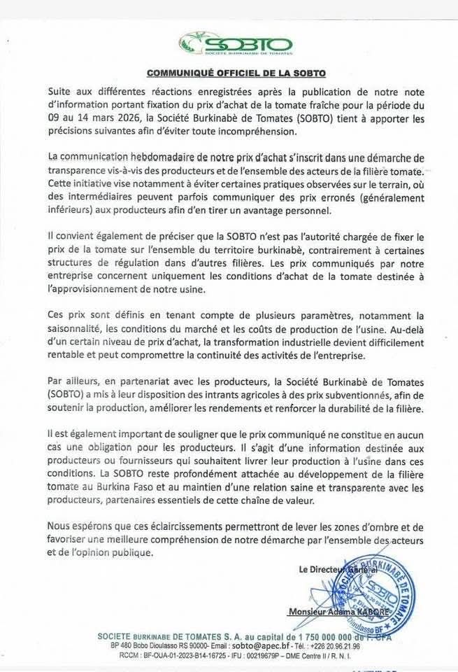 Dans un premier communiqué en date du mercredi 11 mars 2026, la Société Burkinabè de tomates (SOBTO) fixait le prix d’achat de la tomate fraîche pour la période allant du 9 au 14 mars 2026 à 125 FCFA/Kg. Depuis l’annonce de ce prix, plusieurs analyses circulent dans les médias et sur les réseaux sociaux.